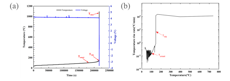 圖2 190Ah電池熱失控(a)溫升/電壓-時間曲線和(b)溫升速率-溫度曲線