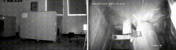 通過視頻監(jiān)控可以發(fā)現(xiàn),190Ah電芯在熱失控階段發(fā)生了猛烈的煙氣噴發(fā)和火焰噴射現(xiàn)象。此外,據(jù)實驗現(xiàn)場觀察,雖然儀器無損傷,但電芯爆炸引發(fā)的氣流沖擊能夠?qū)?米外的物體造成明顯的破壞力。因此,進行大容量高鎳電芯測試,為確保安全實驗室必須具備足夠的泄爆面積。