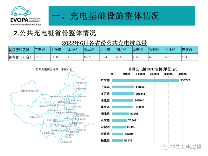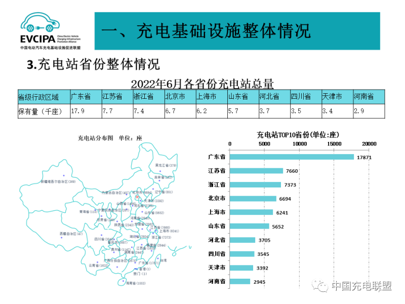 2、公共充電基礎(chǔ)設(shè)施省、區(qū)、市運(yùn)行情況,廣東、上海、江蘇、浙江、北京、湖北、山東、安徽、河南、福建TOP10地區(qū)建設(shè)的公共充電樁占比達(dá)71.7%。全國充電電量主要集中在廣東、江蘇、四川、浙江、福建、河北、陜西、湖北、河南、山西等省份,電量流向以公交車和乘用車為主,環(huán)衛(wèi)物流車、出租車等其他類型車輛占比較小。2022年6月全國充電總電量約19.3億度,較上月增加3.7億度,同比增長109.3%,環(huán)比增加23.8%。
