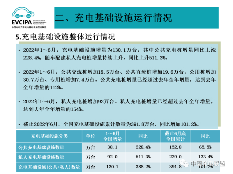 4、充電基礎(chǔ)設(shè)施整體運(yùn)行情況,2022年1~6月,充電基礎(chǔ)設(shè)施增量為130.1萬臺,其中公共充電樁增量同比上漲228.4%,隨車配建私人充電樁增量持續(xù)上升,同比上升511.3%。2022年1~6月,公共交流樁增加18.5萬臺、公共直流樁增加19.6萬臺,公用樁增加30.7萬臺、專用樁增加7.4萬臺。公共充電樁增量已經(jīng)超過去年全年增量,達(dá)到去年全年增量的112%。2022年1~6月,私人充電樁增加92萬臺。私人充電樁增量已經(jīng)超過去年全年增量,達(dá)到去年全年增量的154%。截止2022年6月,全國充電基礎(chǔ)設(shè)施累計數(shù)量為391.8萬臺,同比增加101.2%。
