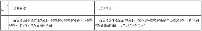 蜂巢能源儲(chǔ)能配光伏項(xiàng)目(100MW/400MWh配光伏400MW)可行性研究報(bào)告編制項(xiàng)目競(jìng)爭(zhēng)性談判公告