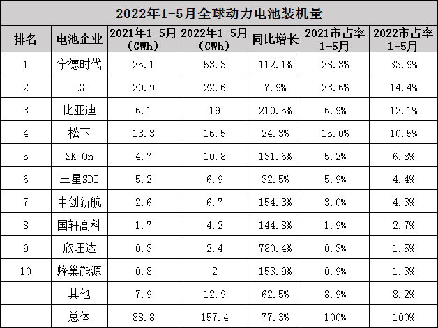數(shù)據(jù)顯示,2022年1-5月全球動(dòng)力電池裝機(jī)量為157.4GWh,其中,寧德時(shí)代穩(wěn)居榜單冠軍,1-5月動(dòng)力電池裝機(jī)量53.3GWh。特別值得注意的是,5月,寧德時(shí)代市占率34%,是韓國LG、SK、三星以及日本松下四家企業(yè)市占率的總和。