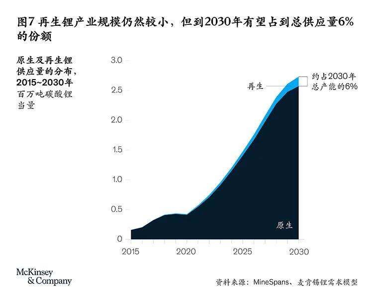鋰離子電池能否回收,已成為一個(gè)人們普遍關(guān)心的問(wèn)題。乘用車(chē)電池的預(yù)期壽命為10到15年,加上儲(chǔ)能行業(yè)有利用廢棄電動(dòng)汽車(chē)電池的可行性,在本世紀(jì)第二個(gè)十年期間,電池回收利用率有望提升,但達(dá)不到顛覆現(xiàn)有格局的程度。通過(guò)不同回收工藝,廢棄電池中的鋰回收率將介于0到80%之間。到2030年,再生鋰有望在總產(chǎn)量中占到略高于6%的份額(見(jiàn)圖7)。