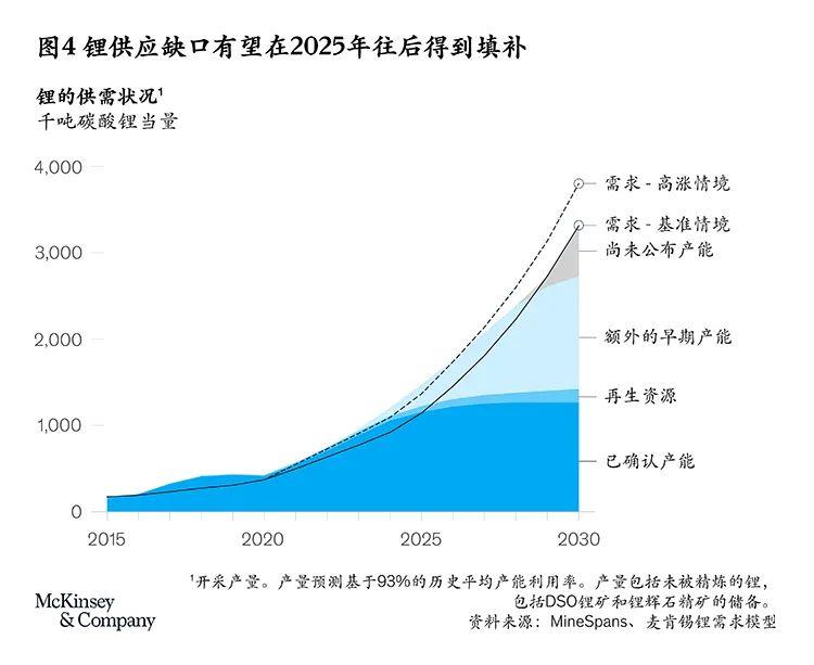 面對(duì)不斷飆漲的需求,世界是否應(yīng)對(duì)未來(lái)的鋰供應(yīng)感到擔(dān)憂(yōu)?2020年,鋰產(chǎn)量略高于41萬(wàn)噸LCE;2021年突破了54萬(wàn)噸,同比增長(zhǎng)32%。在麥肯錫目前的基準(zhǔn)情境分析中,2030年的鋰需求將達(dá)到330萬(wàn)噸,年均復(fù)合增長(zhǎng)率25%。由于制備鋰的前置時(shí)間較短,目前已知的2030年鋰供應(yīng)量約為270萬(wàn)噸;預(yù)計(jì)其余的需求將由新增綠地和棕地?cái)U(kuò)建項(xiàng)目來(lái)填補(bǔ)。