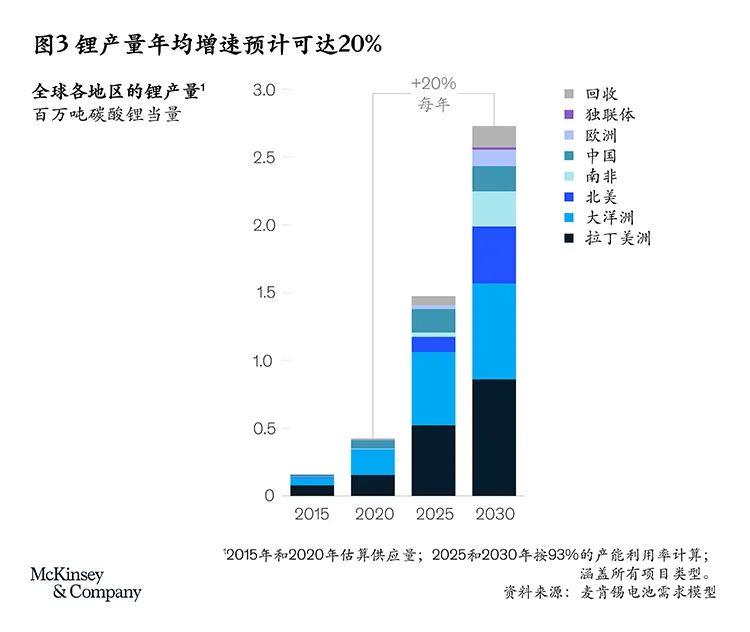 目前,幾乎所有的鋰礦開(kāi)采都集中在澳大利亞、拉丁美洲和中國(guó),2020年的總產(chǎn)量占到全球的98%。一批即將上馬的項(xiàng)目很可能帶來(lái)新的玩家,并將鋰礦開(kāi)采的版圖拓展至西歐、東歐、俄羅斯及其他獨(dú)聯(lián)體(CIS)國(guó)家。這些產(chǎn)能應(yīng)該足以推動(dòng)供應(yīng)量以每年20%的速度增長(zhǎng),到2030年達(dá)到270多萬(wàn)噸LCE(見(jiàn)圖3)。