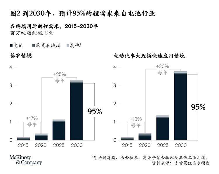 在不久之前的2015年,來(lái)自電池行業(yè)的鋰需求占比不到30%;主要的鋰需求來(lái)自陶瓷、玻璃產(chǎn)業(yè)(35%)和潤(rùn)滑脂、冶金粉末、聚合物等工業(yè)用途(35%以上)。到2030年,電池行業(yè)鋰需求占比有望達(dá)到95%,根據(jù)圖2所列的兩種情境,總需求將以約25%~26%的年增速增至330~380萬(wàn)噸LCE(見(jiàn)圖2)。