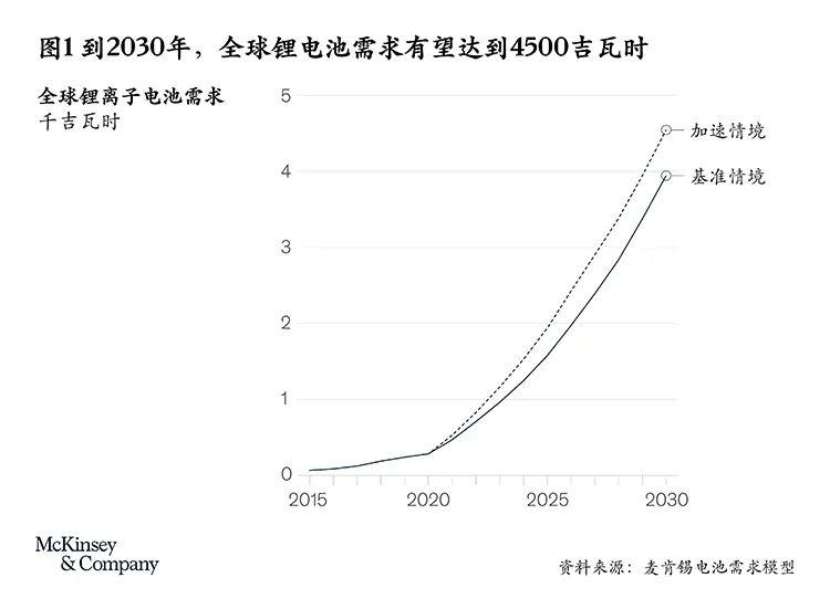 麥肯錫預(yù)計(jì),今后十年,鋰離子電池市場(chǎng)將以約30%的年均復(fù)合增長(zhǎng)率持續(xù)增長(zhǎng)。到2030年,電動(dòng)汽車(chē)、儲(chǔ)能系統(tǒng)、電動(dòng)自行車(chē)、電動(dòng)工具及其他電池密集型應(yīng)用場(chǎng)景有望總共產(chǎn)生4000~4500吉瓦時(shí)的鋰離子電池需求(見(jiàn)圖1)。