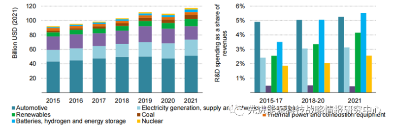 圖8 2015-2021年全球能源上市公司研發(fā)投入及其占營業(yè)收入的比例變化(按領域劃分,單位:十億美元)