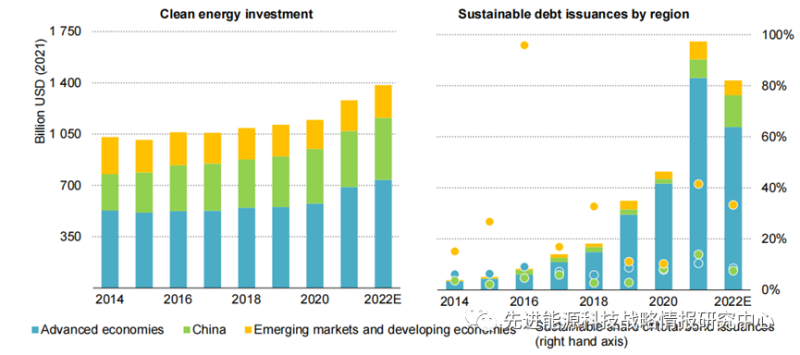 圖6 2014-2022年不同經(jīng)濟體清潔能源投資規(guī)模與可持續(xù)債務變化趨勢(單位:十億美元)