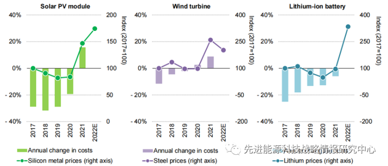 自2021年初以來,關鍵原材料(特別是鋰、鈷、鎳、銅和鋁)的價格漲幅達過去十年最高水平,原因是需求增加、供應鏈中斷、供應緊張的負面影響。許多對清潔能源技術至關重要的原材料價格普遍上漲,鋰和鈷的價格在2021年翻了一番多,銅、鎳和鋁的價格都上漲了25%-40%左右。2021年,風機和太陽能光伏組件的價格分別上漲了9%和16%。