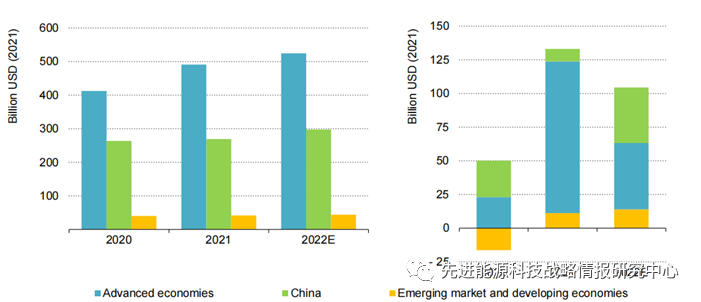 圖3 2020-2022年不同經(jīng)濟體清潔能源投資總額變化趨勢(單位:十億美元)