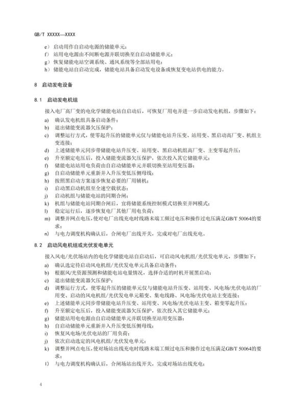 中國儲能網(wǎng)訊:近日,中電聯(lián)發(fā)布關于征求國家標準《電化學儲能黑啟動技術導則》意見的函。文件中提出,本文件規(guī)定了電化學儲能黑啟動的技術條件、黑啟動準備、自啟動、啟動發(fā)電設備、恢復變電站供電的要求。本文件適用于具備黑啟動能力、可作為黑啟動電源的電化學儲能系統(tǒng)或電站的規(guī)劃、設計、試驗和運行。
