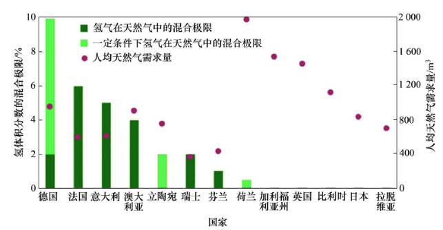 各國/地區(qū)天然氣管道內最高氫體積分數(shù)限制