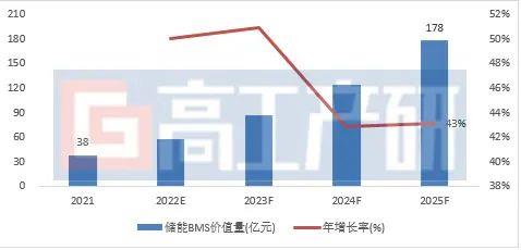 2021-2025年中國(guó)儲(chǔ)能BMS市場(chǎng)規(guī)模及預(yù)測(cè)(億元,%)