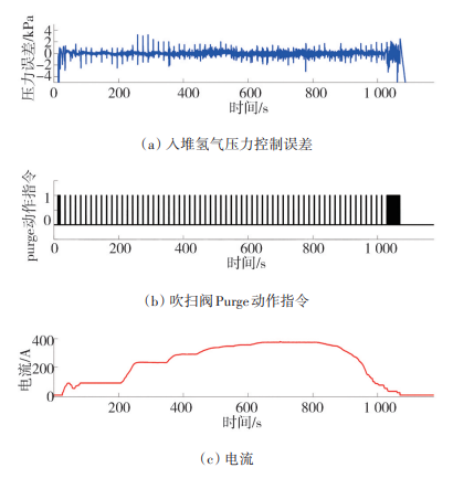 燃料電池發(fā)動機運行過程中壓力誤差隨電流和吹掃閥動作的變化情況