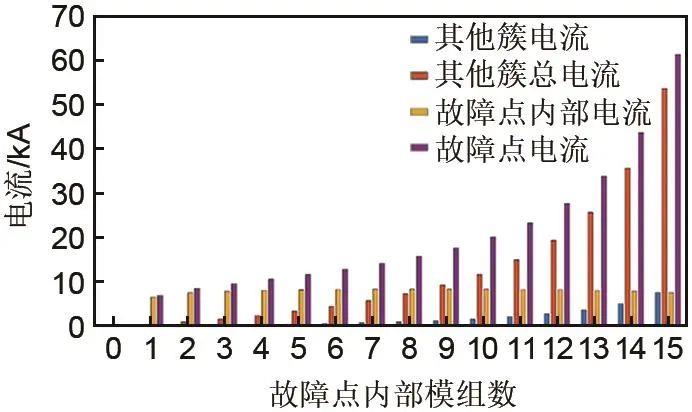 (2)其他簇提供的故障電流逐漸增大,當故障點內(nèi)模組數(shù)為15即在簇首末端發(fā)生故障時,其他簇提供的故障電流與故障點內(nèi)故障電流相同,此時的電流即為故障點外部最大故障電流7.67 kA;