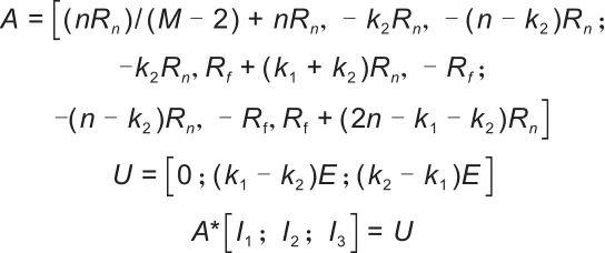 以下以簇1和簇2之間發(fā)生簇間短路為例分析短路計算方法,其他簇間短路故障計算方法與之類似。設(shè)總簇數(shù)為M,每一簇n個電池,簇1短路點到正極k1個電池,簇2短路點到正極k2個電池,其中k1<n,k2<n;每個電池內(nèi)電動勢為E,內(nèi)阻Rn,故障電阻Rf。其他所有簇流入正極電流為I1,簇2流入正極電流為I2,負極流入簇2電流為I3。根據(jù)電路列出回路電流法方程為: