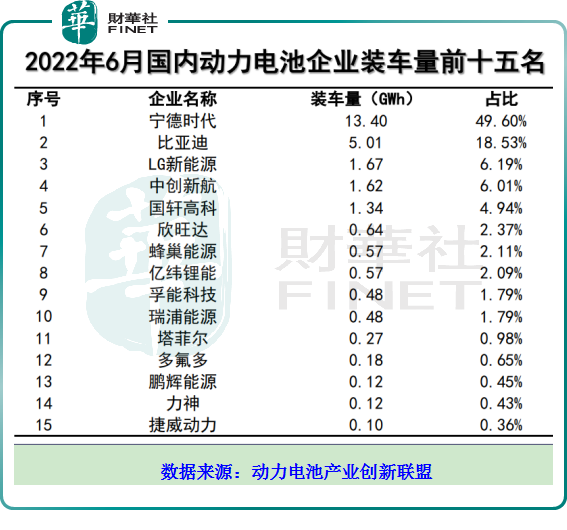 6月,合計(jì)37家動(dòng)力電池企業(yè)實(shí)現(xiàn)電池出貨,較去年同期淘汰2家。其中前十五名的裝車量情況如下所示: