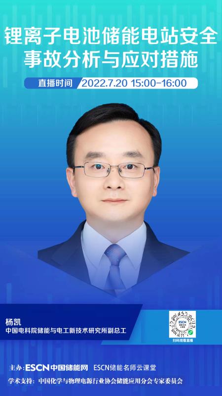 7月20日下午15:00-16:00,中國(guó)儲(chǔ)能網(wǎng)邀請(qǐng)中國(guó)電科院儲(chǔ)能與電工新技術(shù)研究所副總工楊凱博士做客“ESCN儲(chǔ)能名師云課堂”(在線直播),為大家分享《鋰離子電池儲(chǔ)能電站安全事故分析與應(yīng)對(duì)措施》主題報(bào)告。歡迎業(yè)界同仁在線學(xué)習(xí)與交流。
