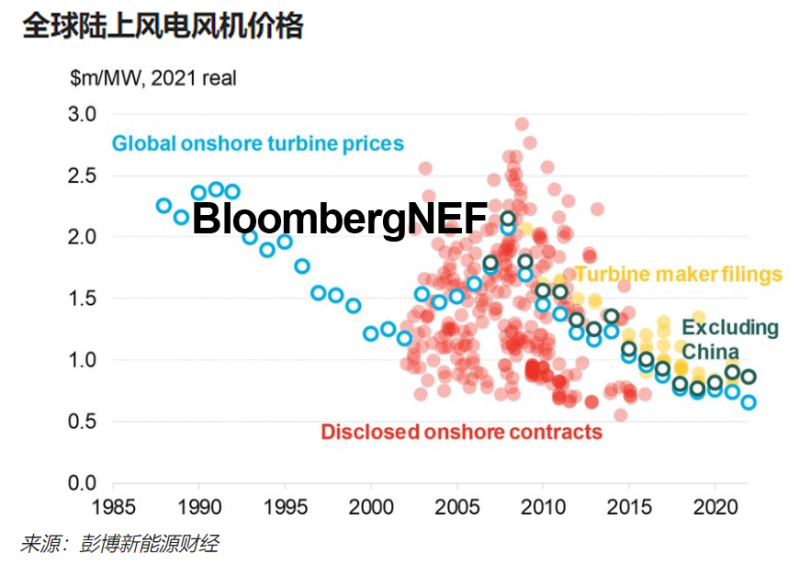 中國與全球其他風電市場的定價差距不斷擴大。在中國,得益于開發(fā)商在補貼取消后爭取更低價協(xié)議、本土供應鏈強大且有競爭力以及4-5MW更大型風機開始普及,風機售價已經跌至新低,與通脹趨勢背道而馳。
