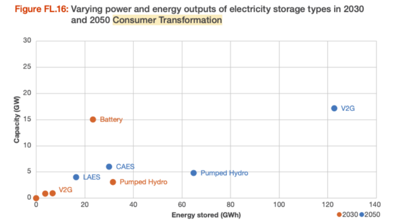 National Grid公司每年都會發(fā)布一份這樣的調(diào)查報告,將概述英國到2050年未來能源的四種不同場景,包括每種場景所需部署的儲能系統(tǒng)裝機容量 (涵蓋所有儲能技術,包括電池儲能系統(tǒng)、抽水蓄能、空氣壓縮儲能系統(tǒng)等)。