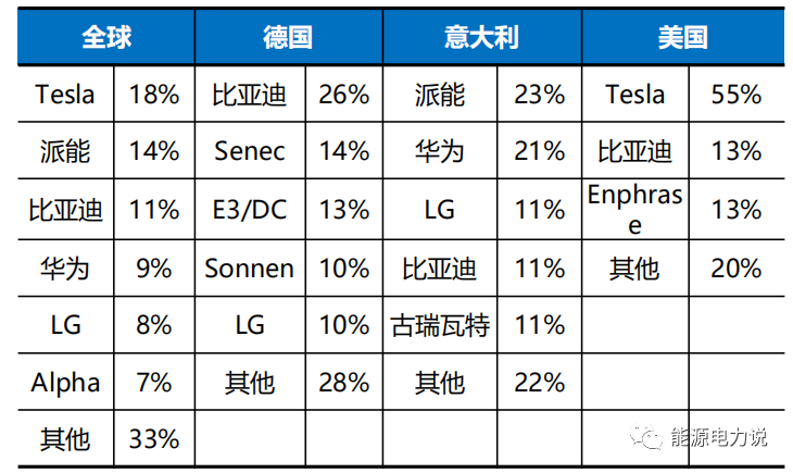 2021年戶(hù)用儲(chǔ)能全球、德、意、美供應(yīng)商分布