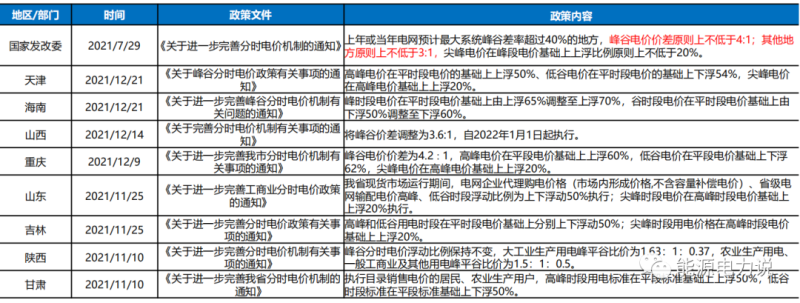 G2021年底,全國(guó)多個(gè)省市陸續(xù)出臺(tái)相關(guān)政策調(diào)整峰谷價(jià)差推動(dòng)用戶(hù)側(cè)儲(chǔ)能發(fā)展。2021年7月29日國(guó)家發(fā)改委發(fā)布《關(guān)于進(jìn)一步完善分時(shí)電價(jià)機(jī)制的通知》,此次分時(shí)電價(jià)機(jī)制設(shè)定峰谷電價(jià)價(jià)差為4:1或3:1以上,拉大峰谷電價(jià),刺激用戶(hù)側(cè)儲(chǔ)能發(fā)展。