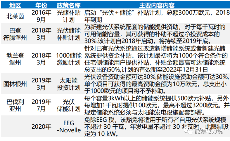 德國(guó)及各州政府均出臺(tái)過(guò)補(bǔ)貼與稅收減免政策降低戶(hù)儲(chǔ)的安裝成本從而來(lái)支持戶(hù)儲(chǔ)發(fā)展,其中圖林根州儲(chǔ)能設(shè)備補(bǔ)貼30%,巴伐利亞州3kwh以上提供500歐元補(bǔ)貼,每增加1kwh多100歐元補(bǔ)貼。