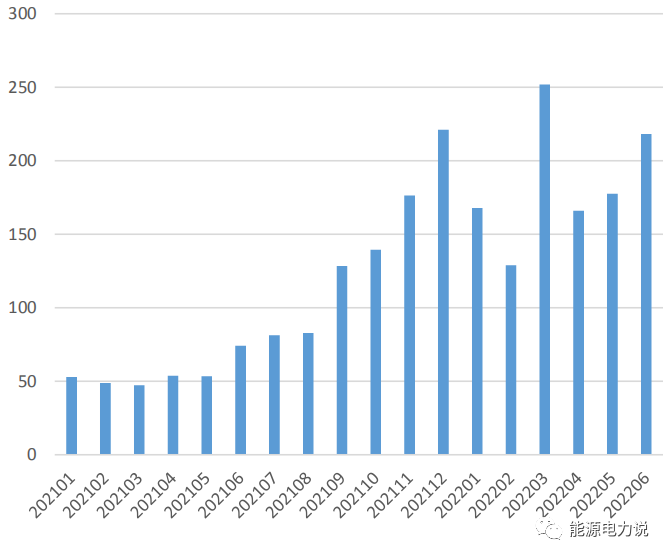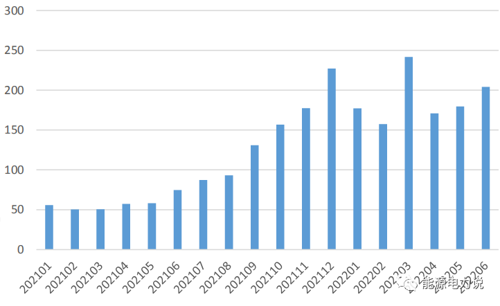 2021年德國(guó)新增戶(hù)用儲(chǔ)能1.48GWh,同增45%,占全球的34%;累計(jì)裝機(jī)3.92GWh,同增60.6%,占全球的32%。2021年德國(guó)光儲(chǔ)滲透率為3.6%,位居全球第一。能源危機(jī)下,電價(jià)上漲,刺激戶(hù)儲(chǔ)需求高增。德國(guó)平均批發(fā)電價(jià)從2021年1月的52.8歐元/MWh上漲至2022年6月的最高206歐元/MWh,增長(zhǎng)313%。