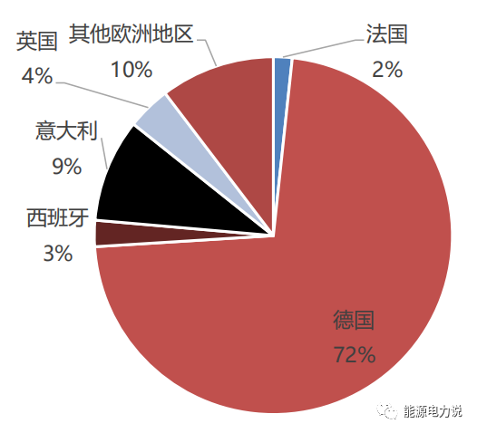 2021年歐洲各國(guó)戶(hù)儲(chǔ)裝機(jī)分布(MWh,%)