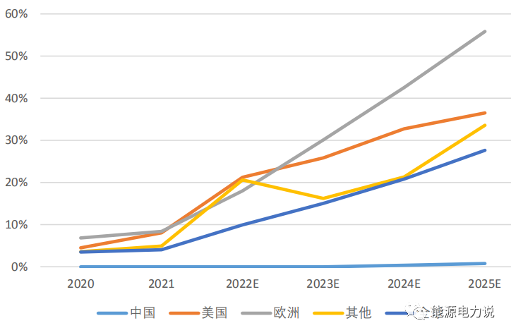 全球戶(hù)儲(chǔ)滲透率有望加速提升,我們預(yù)計(jì)到2025年戶(hù)儲(chǔ)滲透率有望達(dá)28%,其中美國(guó)和歐洲是最重要的兩個(gè)增長(zhǎng)點(diǎn),我們預(yù)計(jì)美國(guó)戶(hù)儲(chǔ)滲透率有望從2021年8%提升至2025年36%,歐洲戶(hù)儲(chǔ)滲透率有望從2021年8%提升至2025年56%。