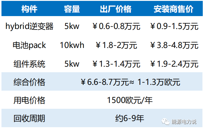 假設(shè)系統(tǒng)由5kW逆變器及10kWh儲(chǔ)能電池構(gòu)成,系統(tǒng)售價(jià)為逆變器、電池、組件及安裝費(fèi)用三者之和共6.6萬(wàn)元≈1萬(wàn)歐元。假設(shè)僅考慮自用10kWh/天,不考慮上網(wǎng),則每日節(jié)省電費(fèi)4歐元,回報(bào)周期為6-9年。如考慮補(bǔ)貼因素,該投資周期可進(jìn)一步縮短至2-3年。