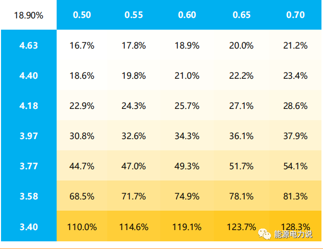美國(guó)戶(hù)儲(chǔ)不同成本及電價(jià)下IRR模擬運(yùn)算(美元)