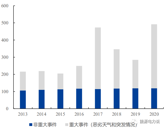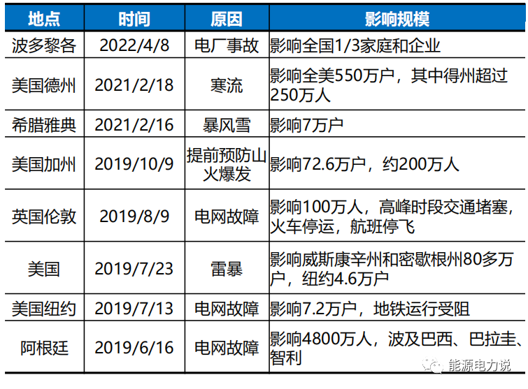 近年來(lái)海外各種大型停電事件突發(fā)。根據(jù)EIA統(tǒng)計(jì),2020年美國(guó)平均每客戶(hù)斷電時(shí)長(zhǎng)高達(dá)492小時(shí),其中惡劣天氣及突發(fā)情況等重大事件導(dǎo)致的停電時(shí)長(zhǎng)為373小時(shí)。2022年中國(guó)臺(tái)灣發(fā)生電廠(chǎng)事故,影響影響549萬(wàn)戶(hù),喪失1050萬(wàn)千瓦,約占全臺(tái)1/3電力。