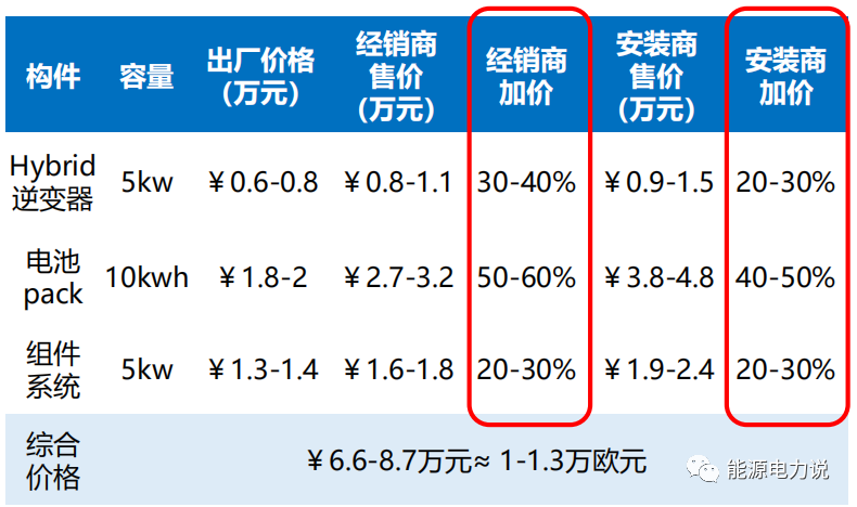 目前國(guó)內(nèi)定價(jià)偏低,保證20%-30%毛利,一體機(jī)的毛利高于僅出售電池或者逆變器的毛利。海外定價(jià)模式下,人工工資及海外差旅費(fèi)用提高成本,此外還需考慮5%左右的返修/售后費(fèi)用等。海外銷(xiāo)售價(jià)格經(jīng)經(jīng)銷(xiāo)商及安裝商分別加價(jià)30-50%。