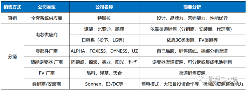 銷(xiāo)售模式包括直銷(xiāo)與分銷(xiāo),品牌與渠道構(gòu)建優(yōu)勢(shì)。三類(lèi)玩家在戶(hù)用儲(chǔ)能產(chǎn)業(yè)鏈中的銷(xiāo)售模式分別如下:
