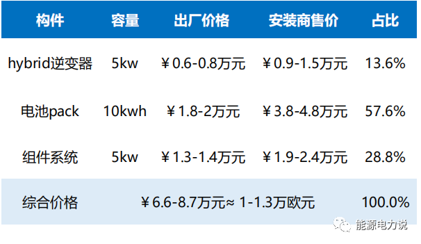 典型的系統(tǒng)一般是5KW(組件+逆變器)配套10kWh(儲(chǔ)能電池)或者10kW+10kWh,其中電芯是儲(chǔ)能系統(tǒng)的核心,成本占比約45-50%;儲(chǔ)能變流器可以控制充放電,進(jìn)行交直流的變換,成本占比約10-15%;組件系統(tǒng)即光伏系統(tǒng)用于太陽(yáng)能發(fā)電,成本占比約20-25%;安裝費(fèi)用由2021年的1萬(wàn)上漲至2萬(wàn)左右,占比15-20%。