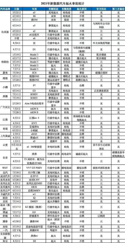 2021年部分新能源汽車火災(zāi)事故統(tǒng)計