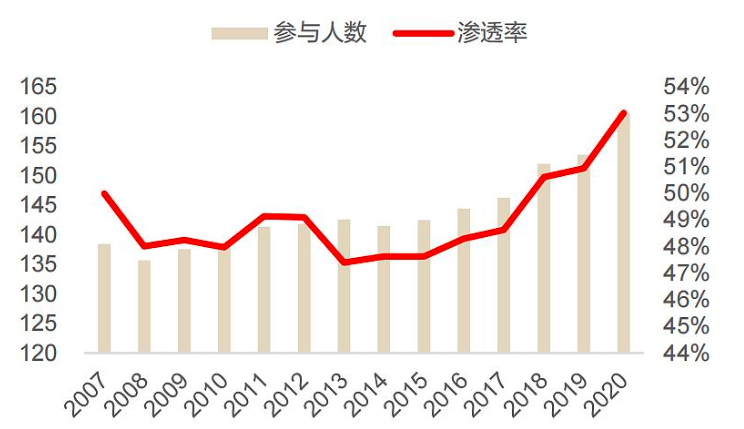 美國戶外活動參與人數(shù)與滲透率(單位:百萬,%)