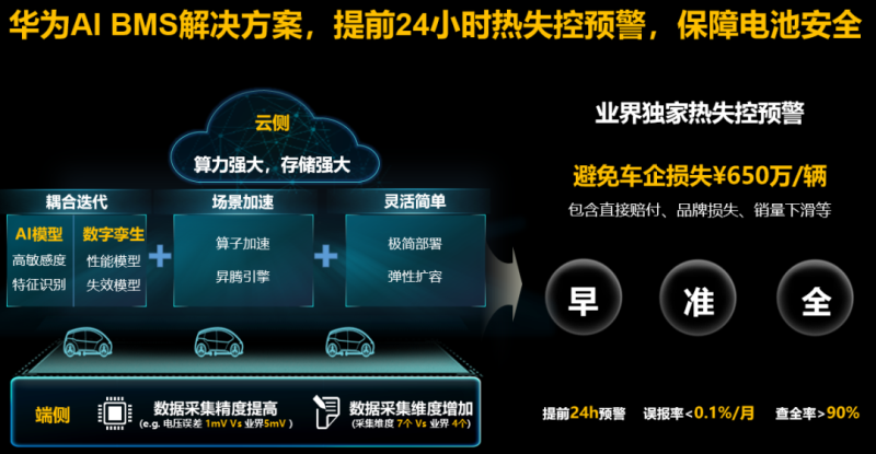 其次,華為AI BMS云端電池管理系統(tǒng),通過AI模型和數(shù)字孿生耦合迭代升級,打造專屬的自學(xué)習(xí)自優(yōu)化人工智能算法,可提前24小時預(yù)警電池?zé)崾Э仫L(fēng)險,風(fēng)險預(yù)警的查全率可高達(dá)90%,誤報率可低至0.1%/月。