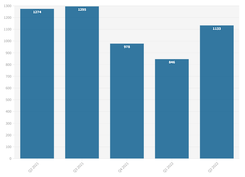 特斯拉公司在2022年第二季度部署了1,133MWh電池儲(chǔ)能系統(tǒng),而2021年第二季度為1,274MWh,2021年第三季度為1,295MWh。然而,與2021年第四季度(978MWh)和2022年第一季度(846MWh)相比,這一數(shù)字有所增加。