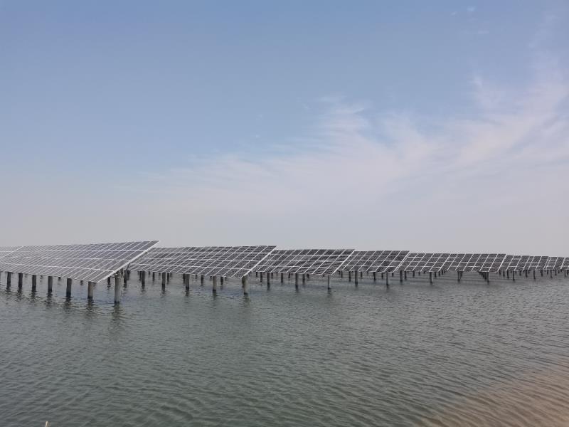 電站建設(shè)區(qū)域為坑塘水面,采用漁光互補運營模式,光伏場區(qū)劃分為11個發(fā)電單元,由11組3.15MW光伏陣列組成,采用PHC預(yù)制管樁、固定支架,共安裝單晶雙玻高效455Wp太陽能電池組件44200塊、450Wp太陽能電池組件44252塊。主要電氣設(shè)施設(shè)備選用技術(shù)先進、功能配套、運轉(zhuǎn)高效的逆變升壓一體機、儲能、無功補償、接地變、PT柜、35kV開關(guān)柜、廠用變及電氣二次設(shè)備、調(diào)度自動化裝置等,設(shè)2回35kv集電線路,1回35kV送出線路,通過9.8km架空線纜,接入臨海110kV變電站,實現(xiàn)與東營市電網(wǎng)并網(wǎng)。