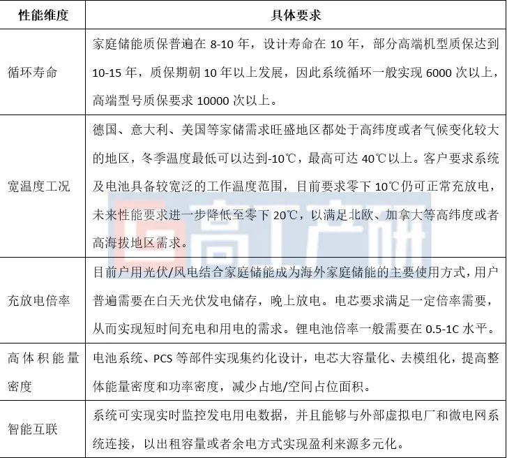 戶用家儲應用于小型戶用備電場合,儲能系統(tǒng)帶電量普遍在5-20KWh。產品要求方面,戶用家儲產品在電氣安全和機械安全得到滿足的前提下,性能要求集中在長循環(huán)壽命、寬溫度工況、充放電倍率和高體積能量密度等方面。產品平臺高壓化是戶用家儲產品發(fā)展重要趨勢。高壓化可降低電流,進而減少放熱量,提升放電效率和安全性。隨著電動車全球范圍普及、居民電價成本持續(xù)提升,戶用家儲系統(tǒng)容量有逐步增加的趨勢,系統(tǒng)容量有望逐步從10KWh以下提升至15KWh以上,戶用PCS功率也將從3KW、5KW提升到8KW乃至三相10KW以上迭代。