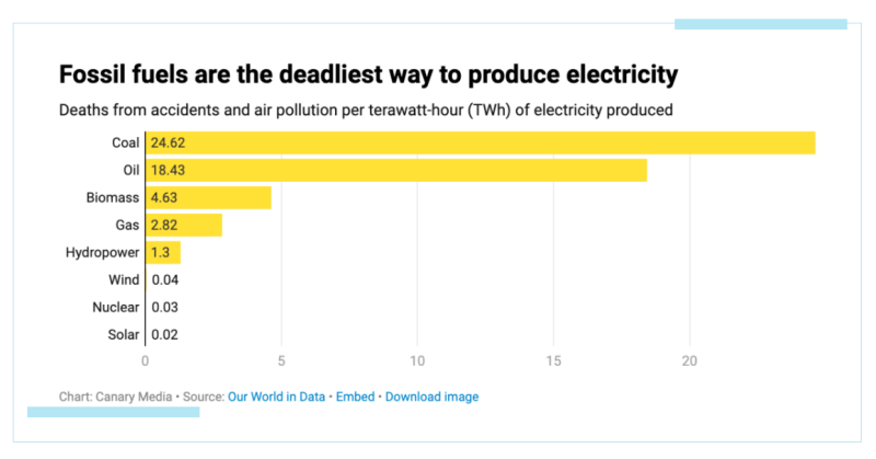 根據(jù)牛津大學(xué)的評(píng)估,煤是世界上發(fā)電量約35%的最致命的能源,每生產(chǎn)太瓦時(shí)電力就有近25人死亡。石油是第二大致命能源,每太瓦時(shí)造成18人以上死亡。天然氣每單位電力造成近3人死亡——比煤炭和石油要少,但仍然明顯高于任何形式的清潔能源。