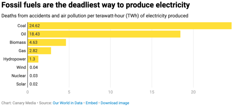 中國儲能網訊:我們說化石燃料是致命的,這不僅僅是因為它們導致了氣候危機。每單位發(fā)電量中,煤炭和石油造成的死亡人數(shù)遠遠超過可再生能源或核能——這只是計算空氣污染和事故造成的死亡人數(shù),而沒有計入氣候變化引發(fā)的災害造成的死亡人數(shù)。