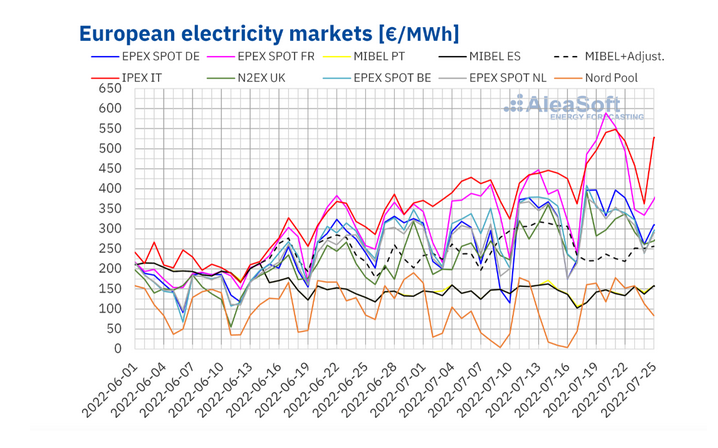 7月第三周,歐洲大部分電力市場的價格較前一周有所上漲。其中,意大利市場的電價遙遙領(lǐng)先,其日前市場電價均值為483.80歐元/兆瓦時,其次是法國、德國的EPEX SPOT市場,分別為475.48歐元/兆瓦時和355.09歐元/兆瓦時。北歐Nord Pool市場價格為149.16歐元/兆瓦時。西班牙和葡萄牙MIBEL市場的電價則有所下降,分別為138.70歐元/兆瓦時和139.60歐元/兆瓦時,但部分消費者必須支付更多費用來補償該市場受到天然氣限價影響的氣電機組。