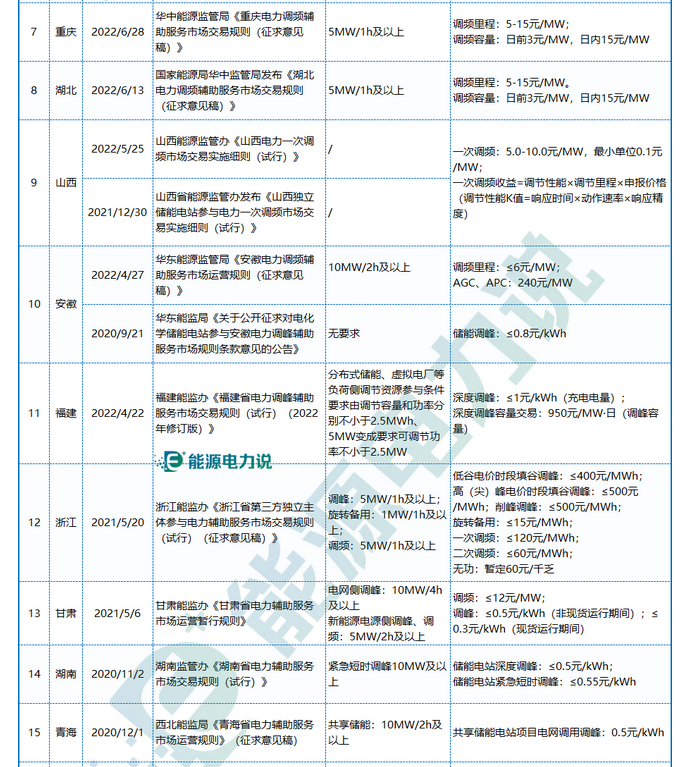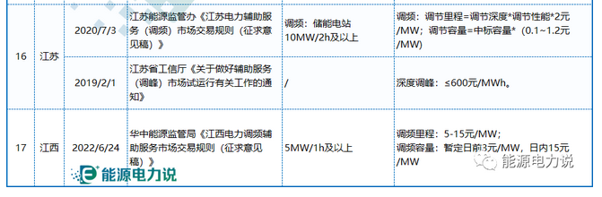 重慶、湖北、山西、安徽、江蘇、江西等省份則出臺(tái)了調(diào)頻輔助服務(wù)市場交易規(guī)則(含征求意見稿),明確了調(diào)頻市場交易規(guī)則及補(bǔ)償標(biāo)準(zhǔn)。