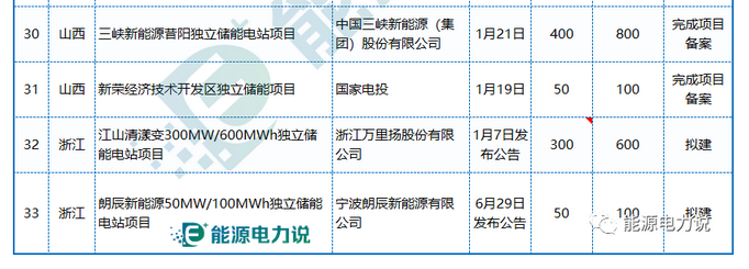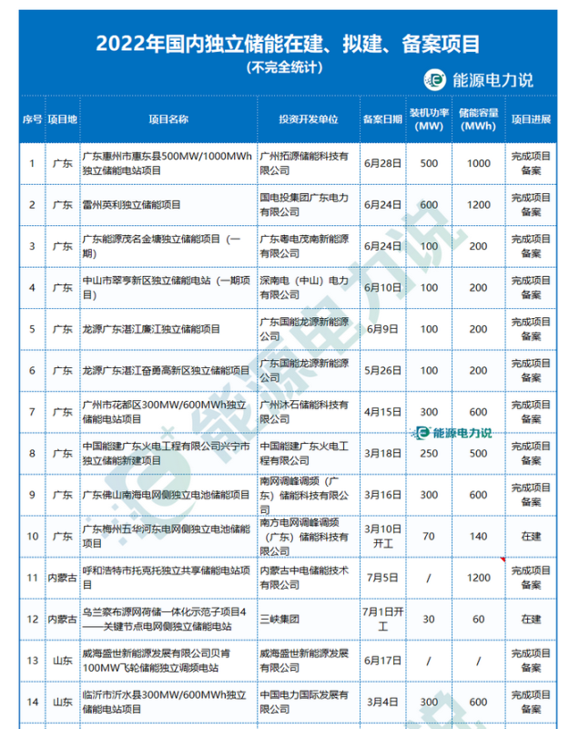 能源電力說統(tǒng)計(jì)了其他省份33個(gè)在建、擬建、完成備案的部分獨(dú)立儲(chǔ)能項(xiàng)目,200MW項(xiàng)目共21個(gè),其中200MW/400MWh、300MW/600MWh項(xiàng)目均8個(gè)。其中廣東的2個(gè)項(xiàng)目規(guī)模更是在500MW以上,廣東惠州市惠東縣獨(dú)立儲(chǔ)能電站項(xiàng)目500MW/1000MWh,廣東雷州英利獨(dú)立儲(chǔ)能項(xiàng)目600MW/1200MWh。