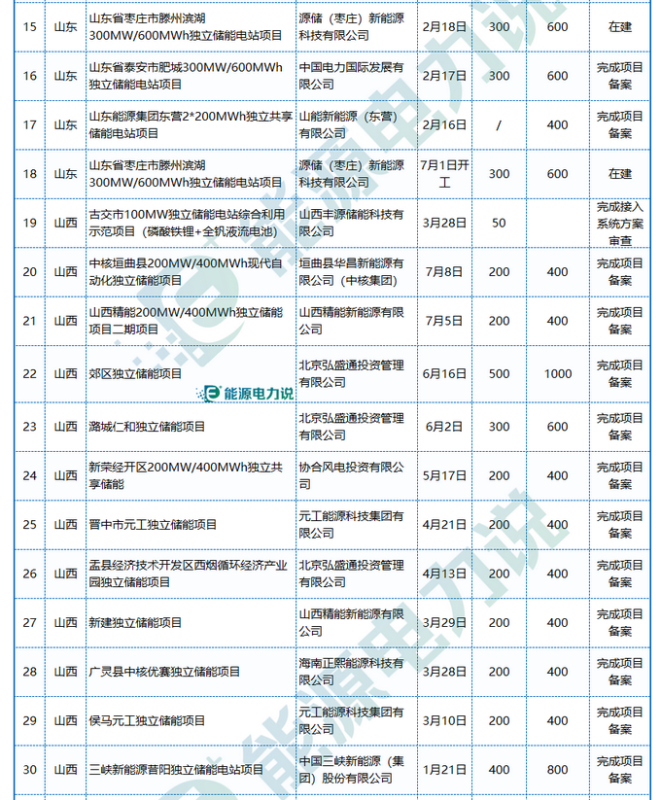 獨(dú)立儲(chǔ)能項(xiàng)目以百兆瓦級(jí)為主。