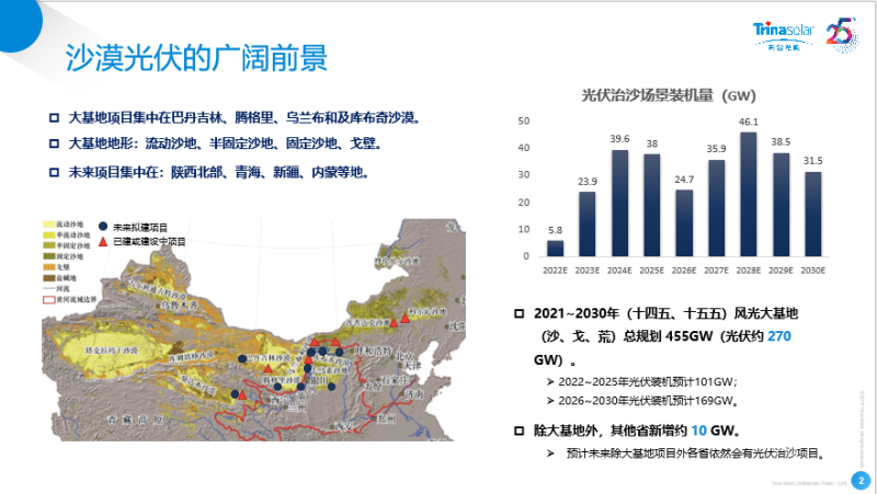 可以預(yù)見的是,在不斷出臺(tái)的利好政策,持穩(wěn)增長(zhǎng)的市場(chǎng)需求以及加速發(fā)展的綠色變革的引領(lǐng)下,光伏大基地項(xiàng)目逐漸成為各省“十四五”規(guī)劃的主流模式之一,大基地項(xiàng)目的發(fā)展帶來了更多的應(yīng)用場(chǎng)景與發(fā)展模式。作為大基地多場(chǎng)景解決方案領(lǐng)軍者,天合光能因地制宜,致力于在光伏系統(tǒng)解決方案發(fā)展進(jìn)步的篇章中提供更優(yōu)質(zhì)的服務(wù)。